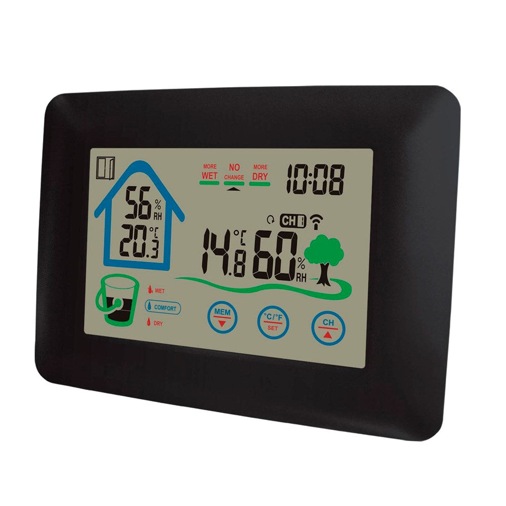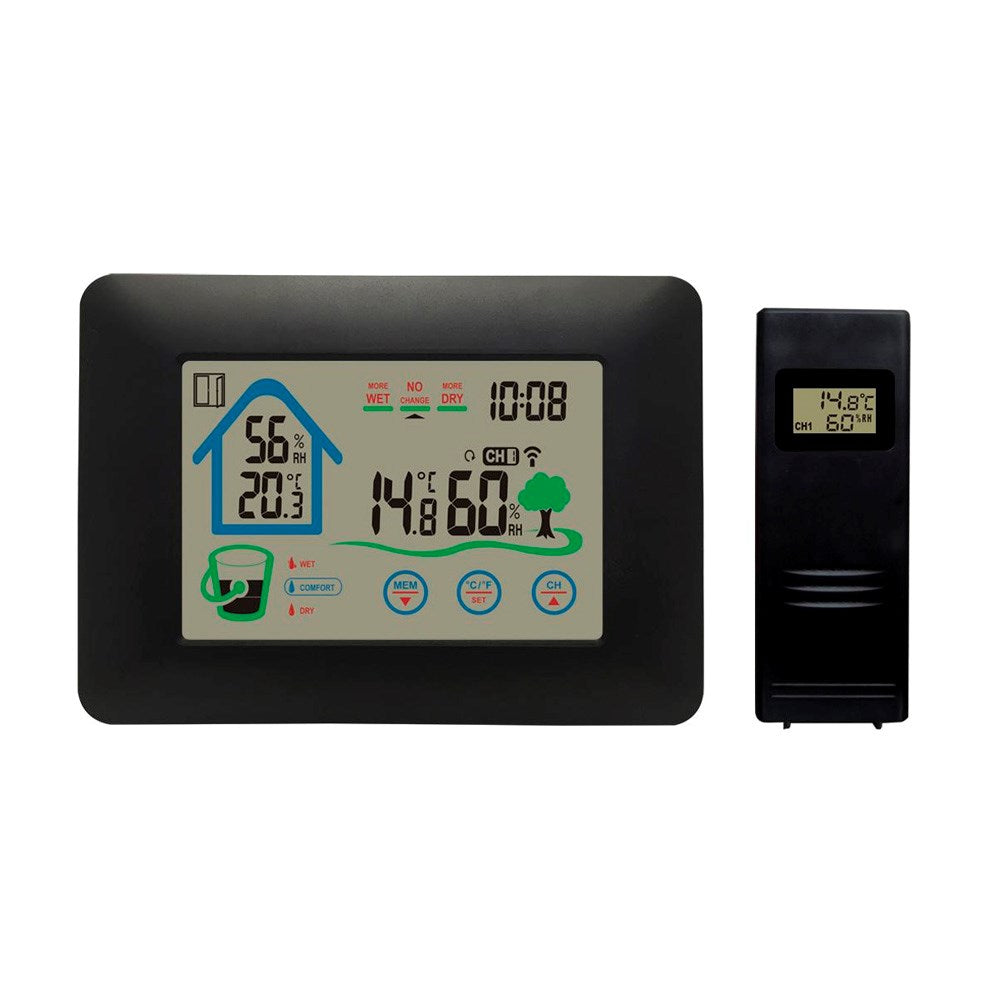 Med sit tydelige LCD-display viser denne vejrstation både temperatur og luftfugtighed for inde- og udendørs miljøer. Den trådløse udendørssensor sender målinger i realtid, så du altid ved, om du skal tage en trøje med, inden du går ud.