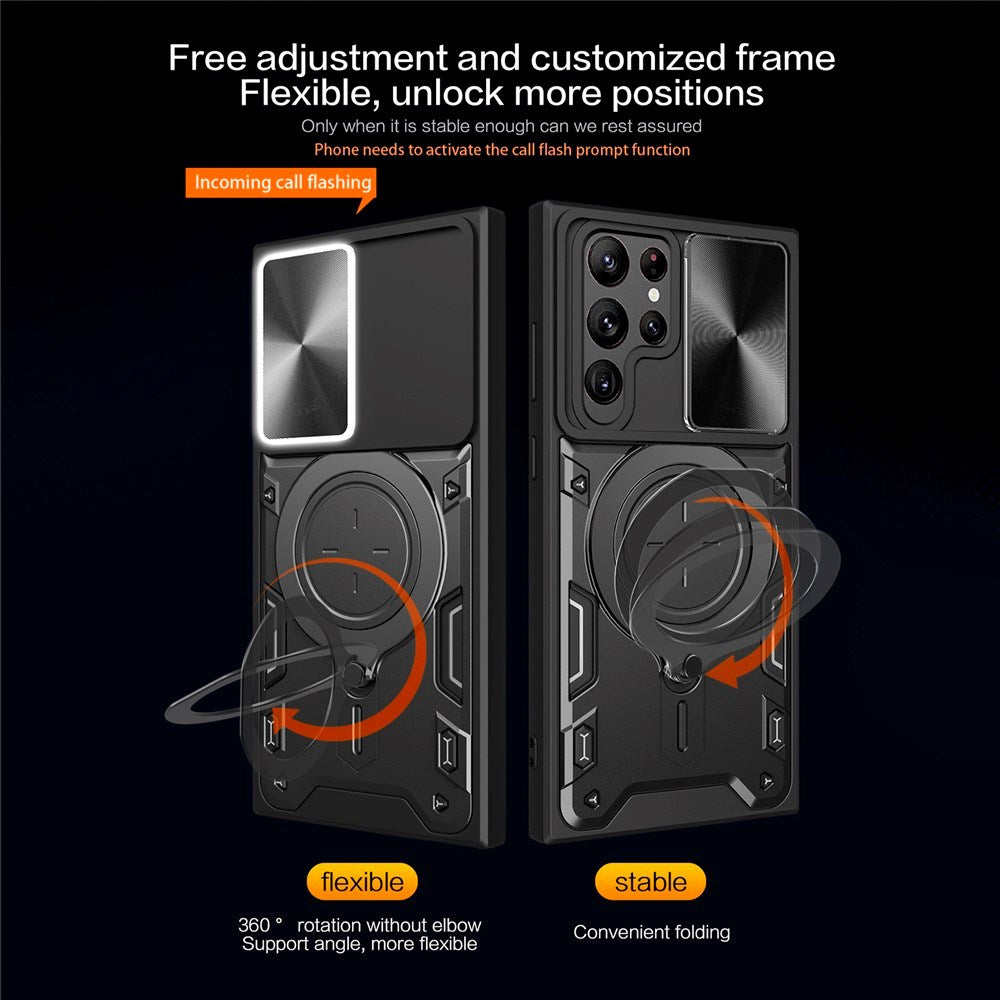 Den indbyggede kameraslider beskytter linsen mod støv og ridser, mens den 360-graders drejelige kickstand giver dig mulighed for nem og komfortabel håndfri visning i både horisontal og vertikal position.