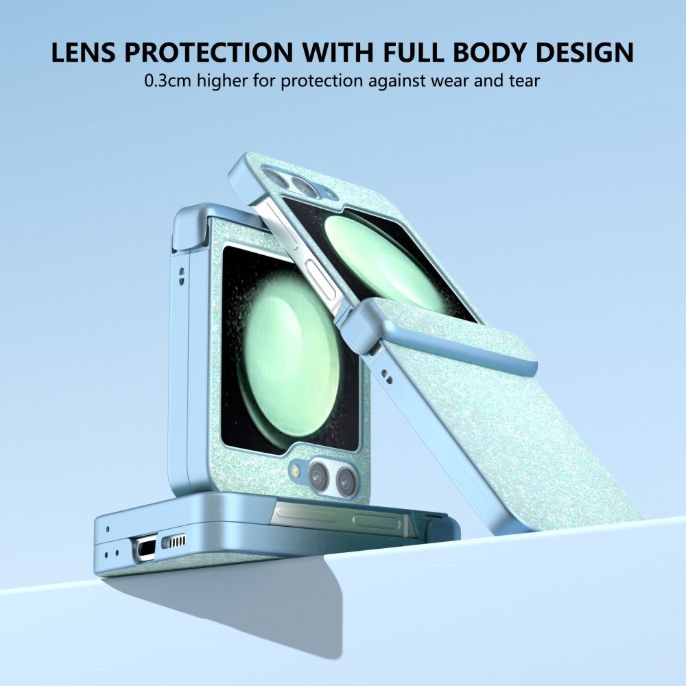 Ydermere er dette Samsung Galaxy Z Flip7 FE / Flip6 cover betrukket på bagsiden med imiteret læder, et materiale som er behageligt at røre ved og som ligger godt i hånden. Det imiterede læder har fået et ekstra lag med en glitrende effekt, for et ekstra speciel touch.