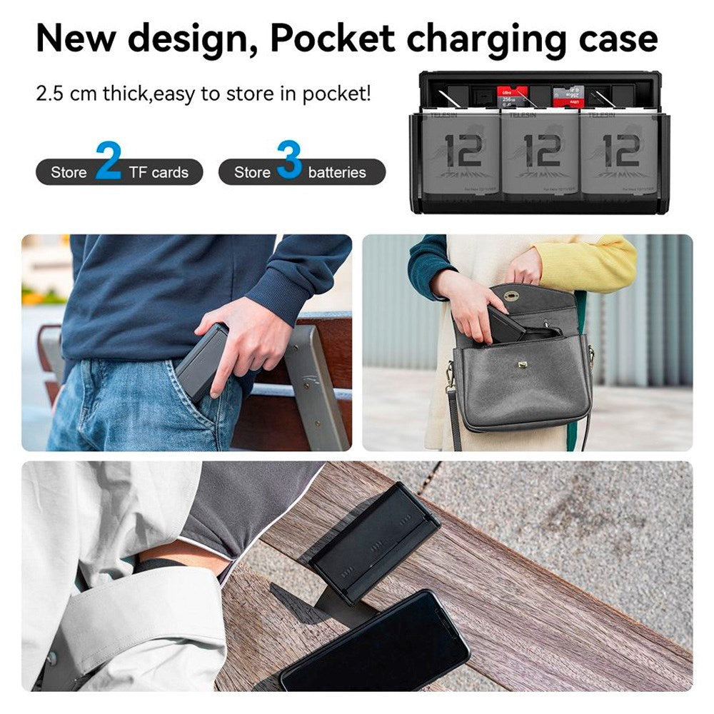 Få mest muligt ud af dine GoPro-optagelser med TELESIN Batteri Opladningscase & 2x Stamina Batteri Kit – den ideelle løsning til GoPro Hero 9 / 10 / 11 / 12-brugere, der ønsker pålidelig strøm og maksimal mobilitet.