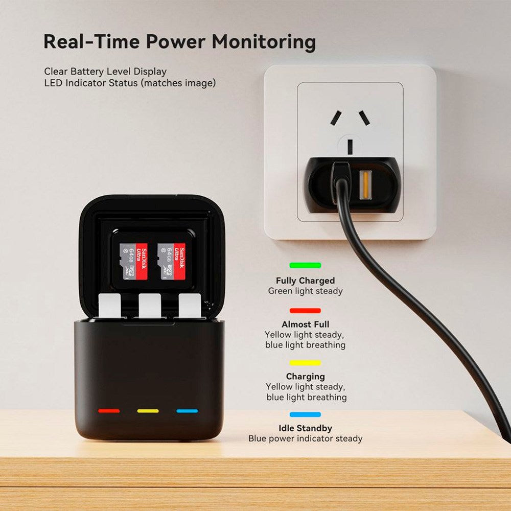 Med TELESIN opladningscase får du en smart og praktisk løsning til både opladning og opbevaring af dine GoPro Hero 13 batterier. Denne kompakte oplader kan oplade op til tre batterier samtidigt, så du altid er klar til at fange hvert øjeblik uden afbrydelser.