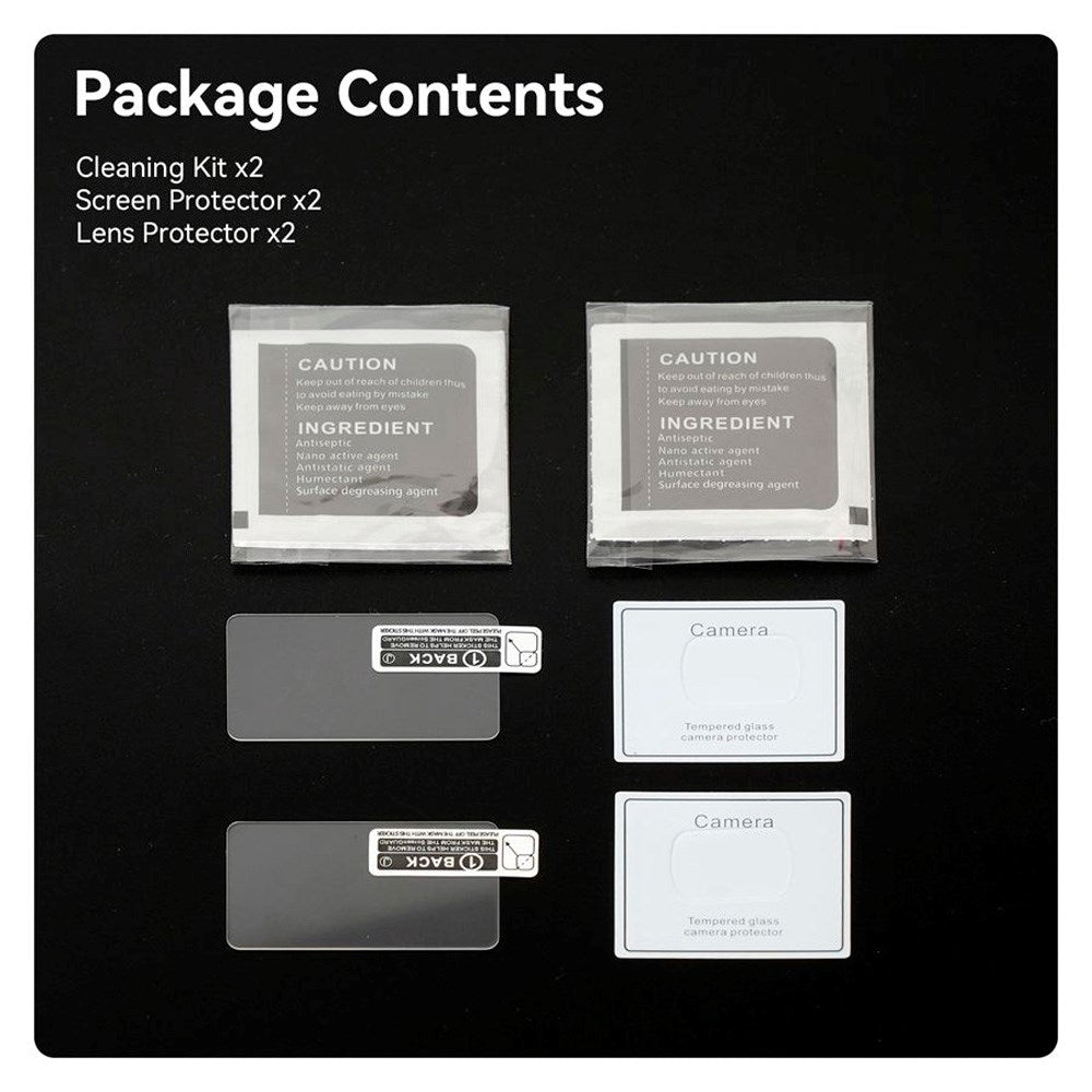 Sættet indeholder to sæt beskyttelsesfilm samt rengøringskits, hvilket gør det let og bekvemt at udskifte beskyttelsen, når det er nødvendigt. Den præcise pasform og den nemme installation sikrer, at glasset lægger sig perfekt på linsen og skærmen uden irriterende luftbobler.