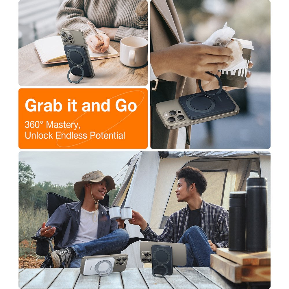 På bagsiden af denne power bank sidder en kickstand, som kan foldes ud efter behov, således power banken og dermed også din telefon kan stå af sig selv. Denne kickstand kan vinkles 120° og roteres 360°, så du kan finde den perfekte placering, når du f.eks. skal se film eller foretage videoopkald på telefonen.