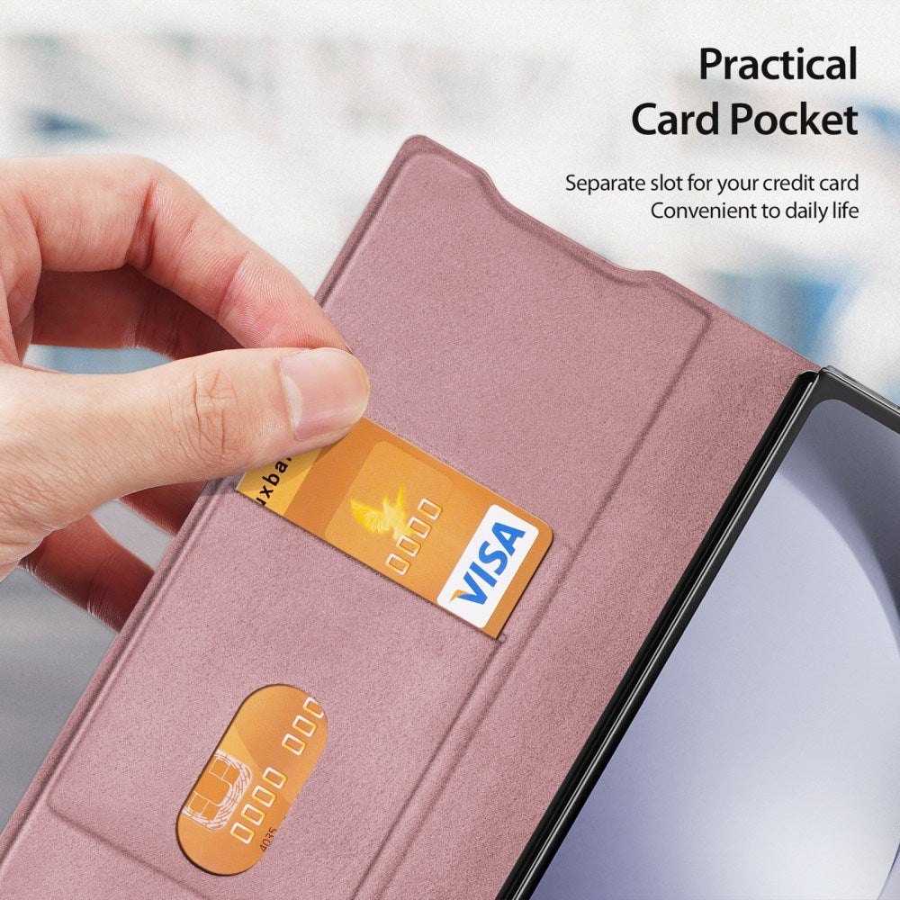 Dette Samsung Galaxy Z Fold6 læder cover er designet, så bagsiden kan foldes på midten, så coveret ikke fylder meget, når mobilen er i brug. Dette er ideelt, hvis man vil se film eller videoer.