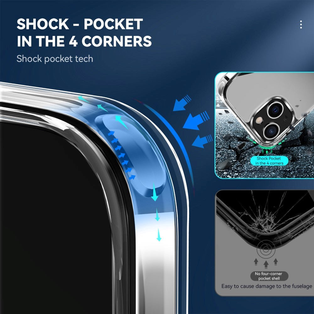 Et gennemsigtigt cover til iPhone 13 som er produceret til beskyttende mod mange slags skader. Coveret er lavet af flere forskellige plastikmaterialer, som sammen skaber rigtig god beskyttelse.