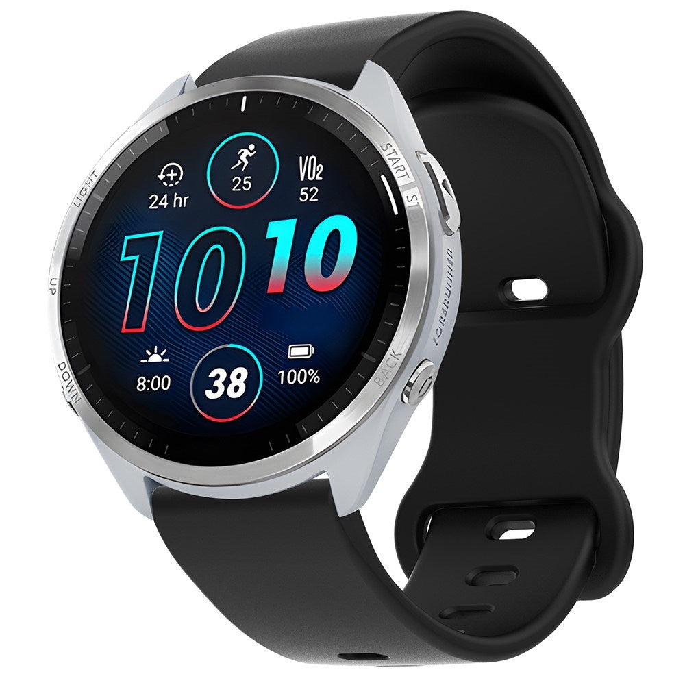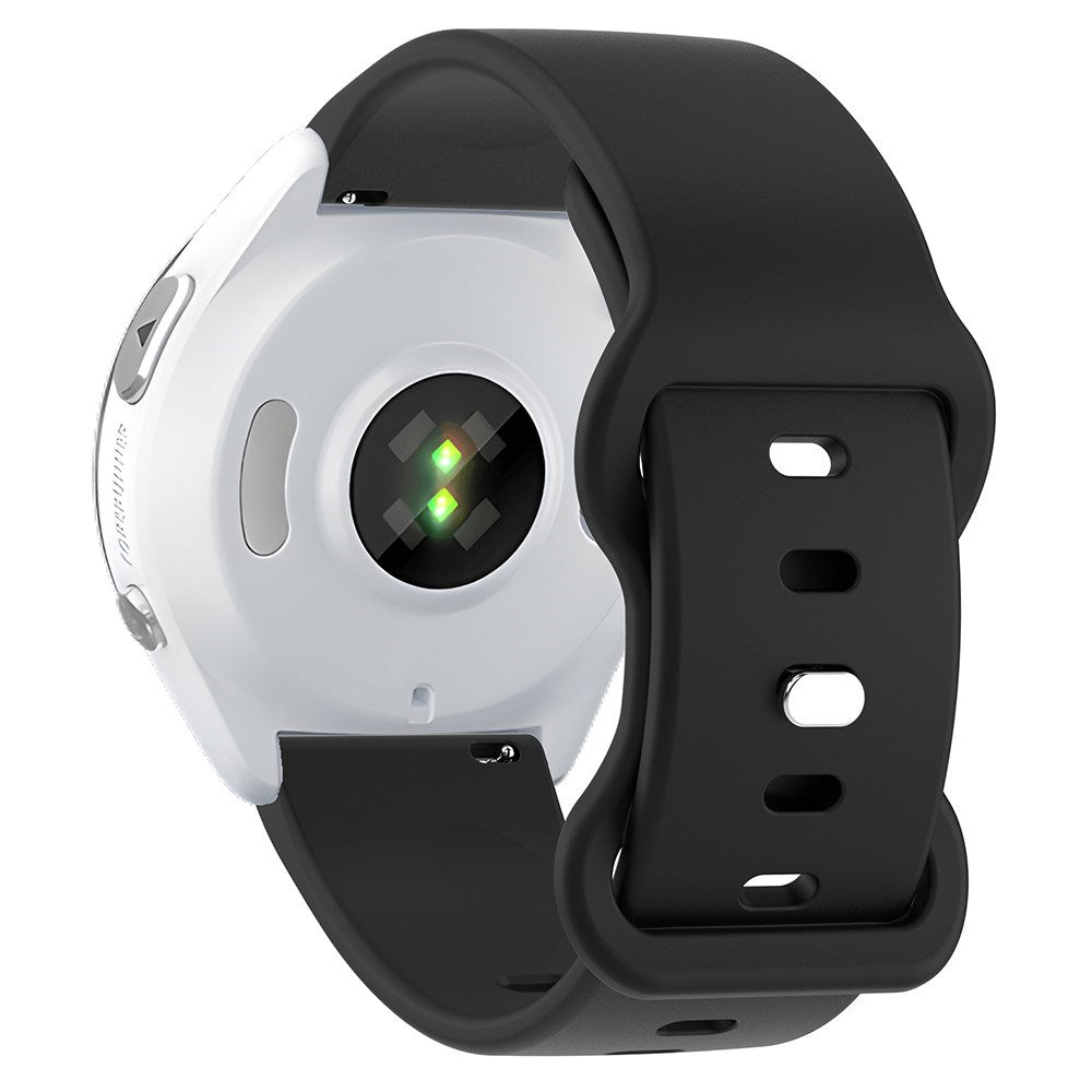 Fremstillet i blødt og fleksibelt silikone, der føles behageligt mod huden. Materialet er vandafvisende, hvilket gør remmen ideel til sport og aktiviteter, hvor du sveder. Den justerbare lukning med flere huller giver mulighed for en personlig og sikker pasform.