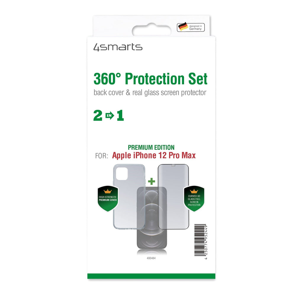 iPhone 12 Pro Max 4smarts 360⁰ Protection Set leverer fuldstændig beskyttelse til din smartphone. Pakken indeholder et såkaldt 'Second Glass', som er optimeret til at give den bedst mulige beskyttelse af skærmen samt et lækkert bagside cover.