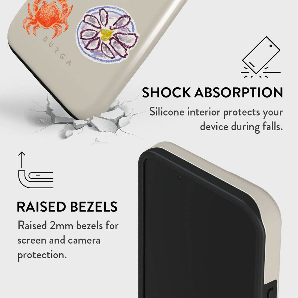 I kombination med coverets exceptionelle visuelle design, har Burga givet coveret en god beskyttende funktion. Coveret er to-delt, hvor den ene del består af en skal af hård plastik, og indersiden er produceret i yderst beskyttende stødabsorberende silikone.