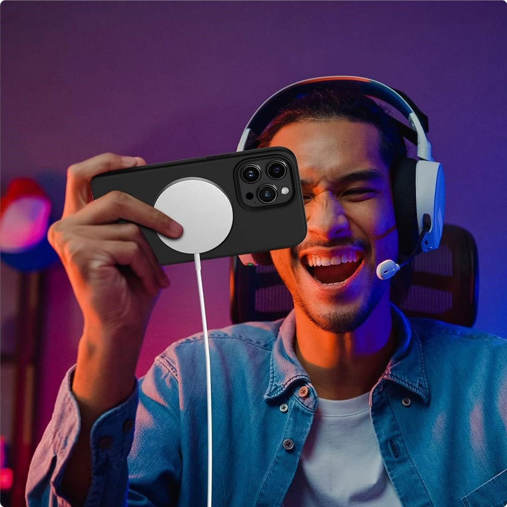 Dette cover er kompatibel med MagSafe, hvilket betyder at det fungerer perfekt sammen med andre MagSafe produkter. Skjult indvendigt i coveret finder du en cirkelformet magnet, som automatisk sørger for at korrigere og placere sig helt korrekt på andre enheder med MagSafe. Det kan eksempelvis være en MagSafe trådløs oplader, MagSafe kortholder eller MagSafe bilholder. Du slipper altså både for at skulle have coveret af ved trådløs opladning, og så har du fordel af at magnet coveret automatisk sørger for at din iPhone ligger helt perfekt på opladeoverfladen.
