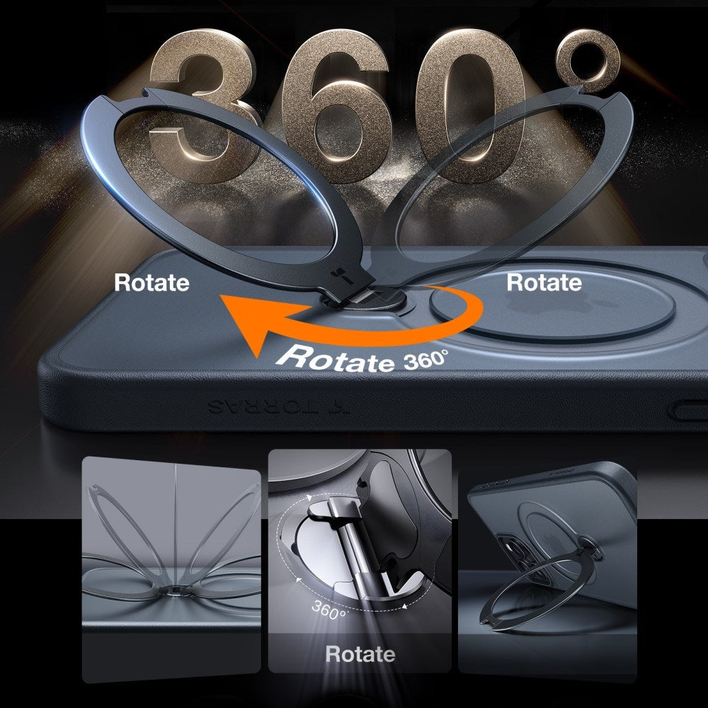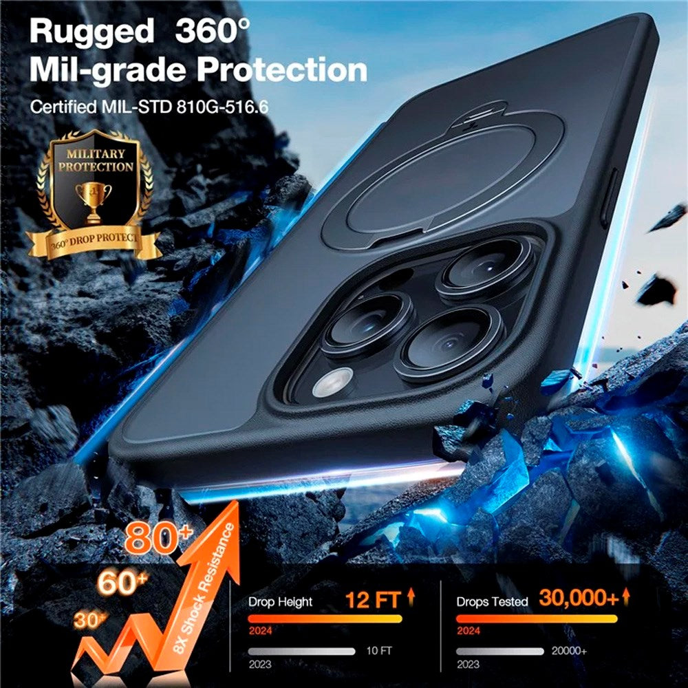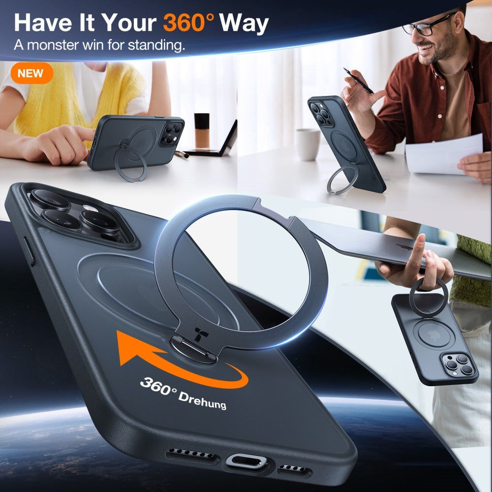 Coveret har desuden en indbygget 360° ståfunktion, der gør det muligt at placere din iPhone 15 Pro i en komfortabel, håndfri vinkel – ideelt til videovisning eller online-møder.