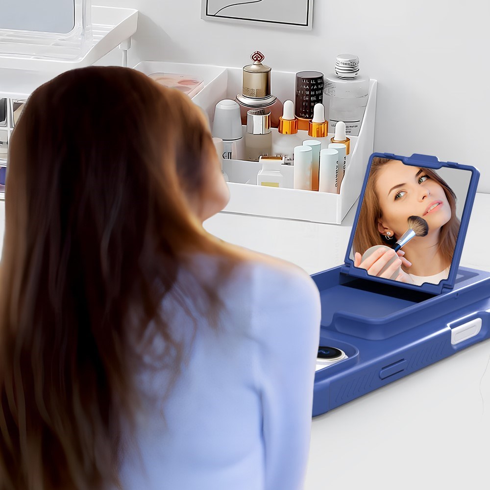Indvendigt på kortholderen sidder desuden et lille spejl, der gør det nemt hurtigt at tjekke, hvordan håret sidder, eller om der er noget mellem tænderne. Når spejlet er slået ud, kan det desuden også bruges som en kickstand, således telefonen kan stå af sig selv - perfekt til f.eks. at se film.