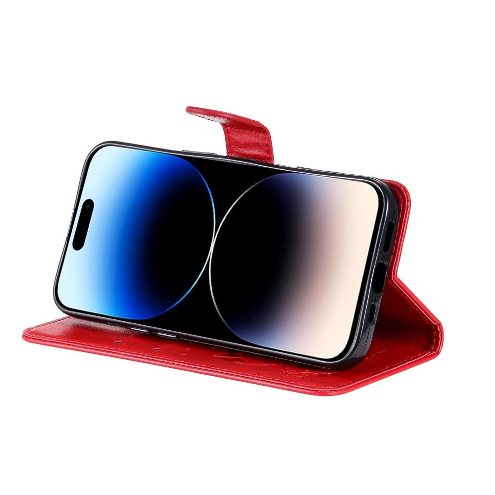 iPhone 15 Pro Læder Flip Cover m. Pung & Strop - Kat Indgravering - Rød