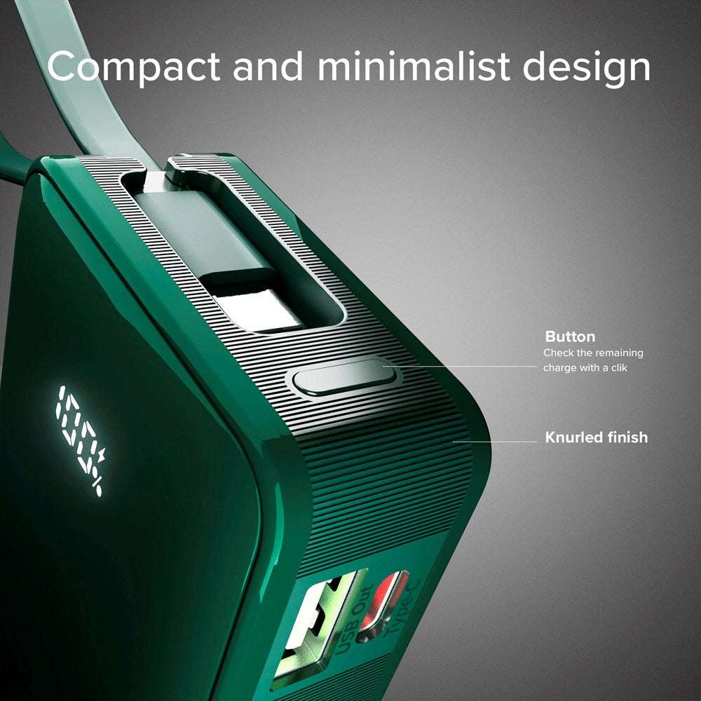 Med et enkelt tryk på tænd/sluk-knappen aktiveres det digitale LCD-display, som viser præcist, hvor meget strøm der er tilbage i PowerBanken. Når batteriet er lavt, kan du nemt oplade den via det indbyggede kabel eller USB-C-porten.