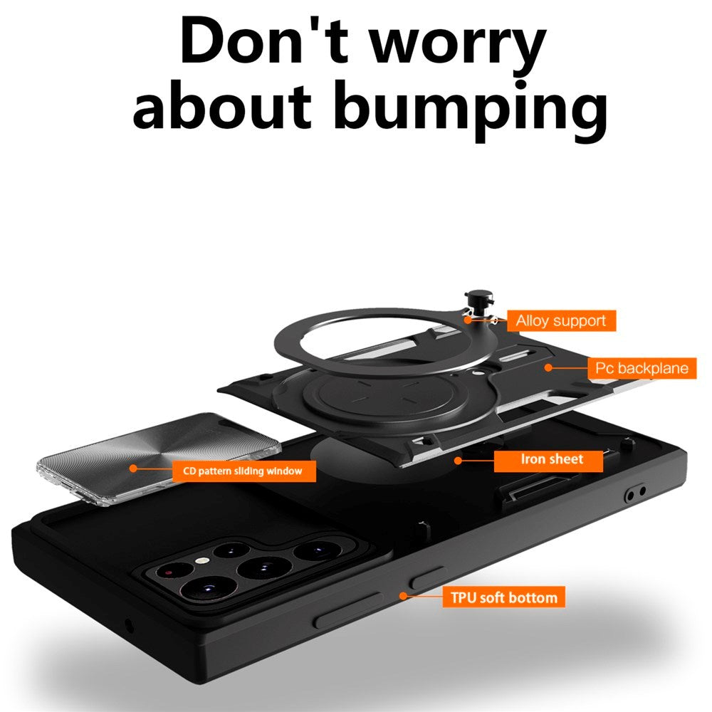 Den indbyggede kameraslider beskytter linsen mod støv og ridser, mens den 360-graders drejelige kickstand giver dig mulighed for nem og komfortabel håndfri visning i både horisontal og vertikal position.