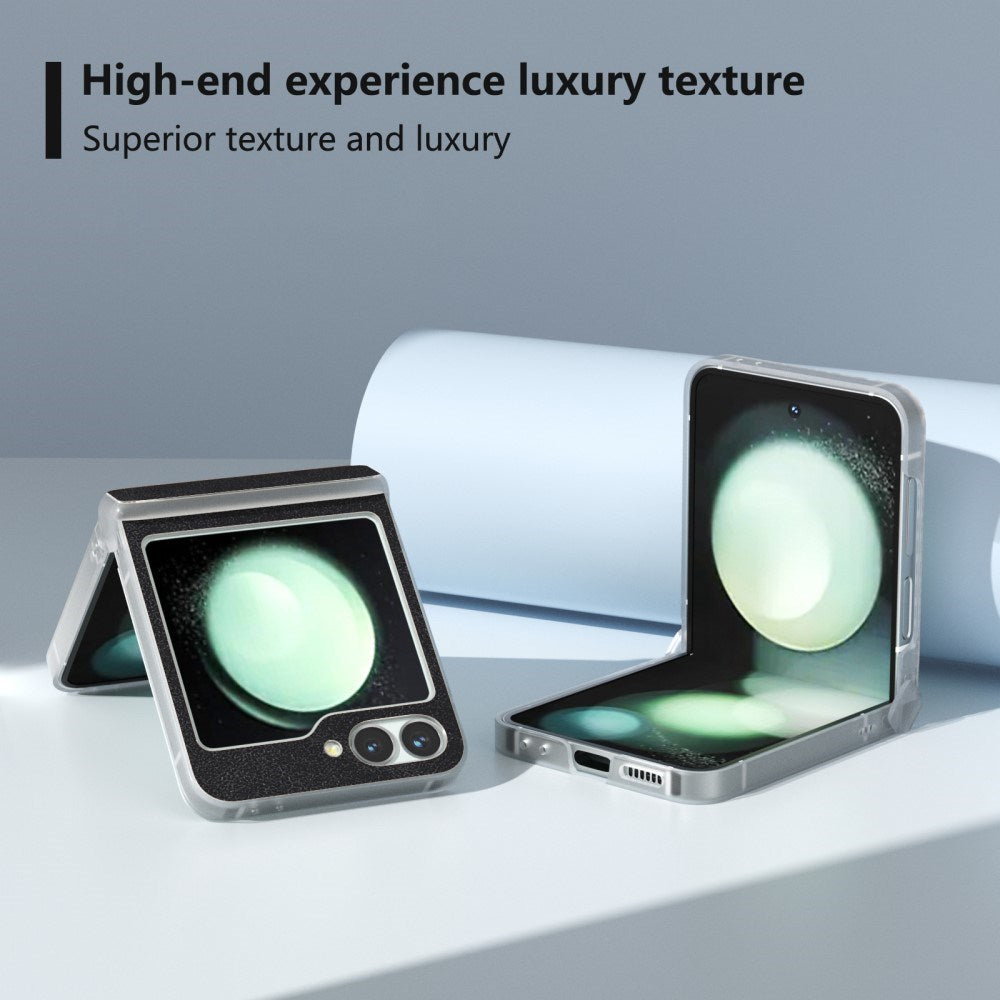 Ydermere er dette Samsung Galaxy Z Flip7 FE / Flip6 cover betrukket på bagsiden med imiteret læder, et materiale som er behageligt at røre ved og som ligger godt i hånden.