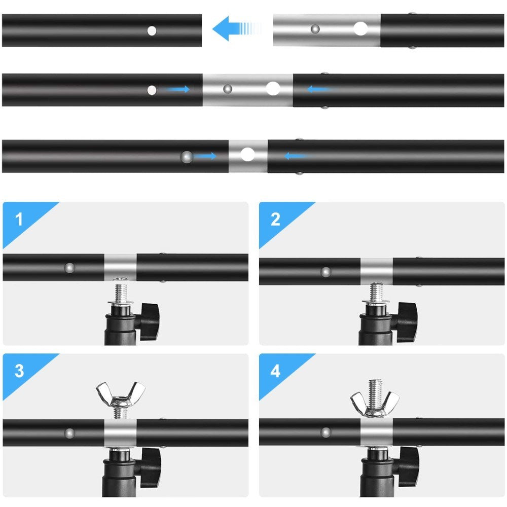 T-stativet gør det nemt at sætte op og sørger for, at det fylder mindre, idet du kun har én tripod bag fotobaggrunden og ikke en i hver side. Selvom det kun er en enkelt tripod, vil du stadig opleve stor stabilitet med dette fotobaggrundssæt, og du behøver derfor ikke bekymre dig om, om den falder ned. De tre klemmer holder desuden sikkert baggrunden på plads.