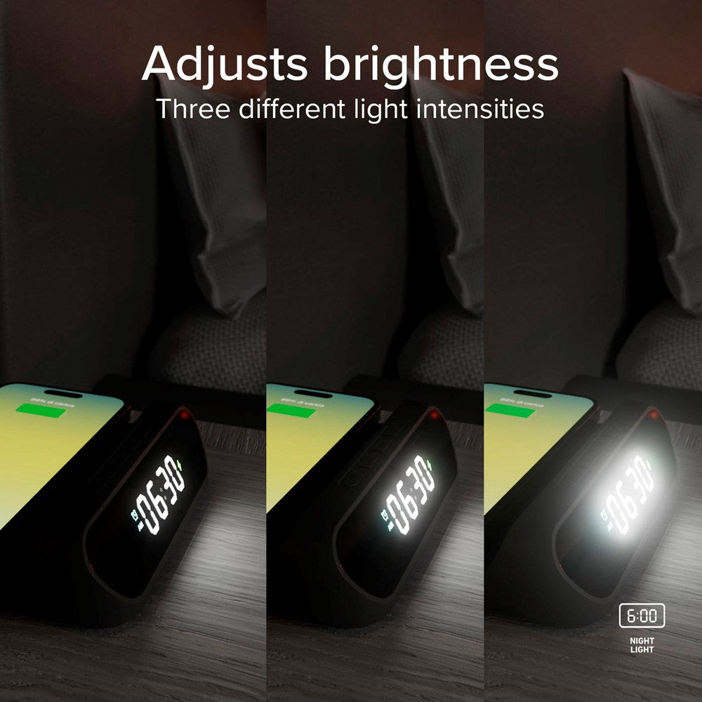 Vækkeuret har et stort digitalt display med 3 justerbare lysstyrker, så du kan tilpasse det til dine præferencer – uden at forstyrre din nattesøvn. Du kan vælge mellem 12- eller 24-timers visning og nyde den klassiske snooze-funktion med 5 minutters intervaller, så du får en rolig og behagelig opvågning.