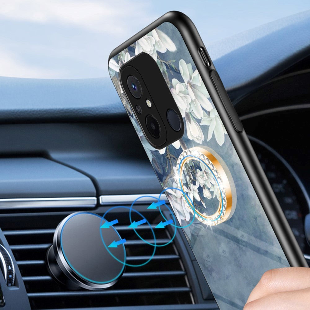 Under den meget solide glasbagside er der et super flot blomster design. Glasset på bagsiden gør, at designet og coveret ser lige lidt mere eksklusivt ud end et normalt Xiaomi Redmi 12C cover i plastik. Der medfølger også en finger ring, som du kan sætte på coveret, hvilket hvilket gøre det nemmere for dig at holde om telefonen med en hånd. Finger ringen kan desuden benyttes som en stander, således du kan stille telefonen på en overflade og se film og serier uden at skulle holde fast om telefonen. Ringen er beklædt med rhinsten og er desuden magnetisk, så den kan sættes fast på diverse magnetiske overflader.