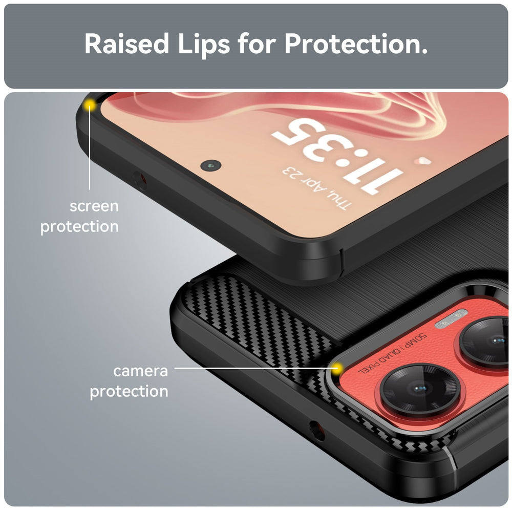 Et fleksibelt plastik cover Motorola Moto G35 5G, der giver en god beskyttelse til din telefon. Dette Motorola Moto G35 5G cover har et sejt carbon look i toppen og bunden kombineret med et børstet metal look. Du får en god beskyttelse mod skrammer og ridser i dette cover.