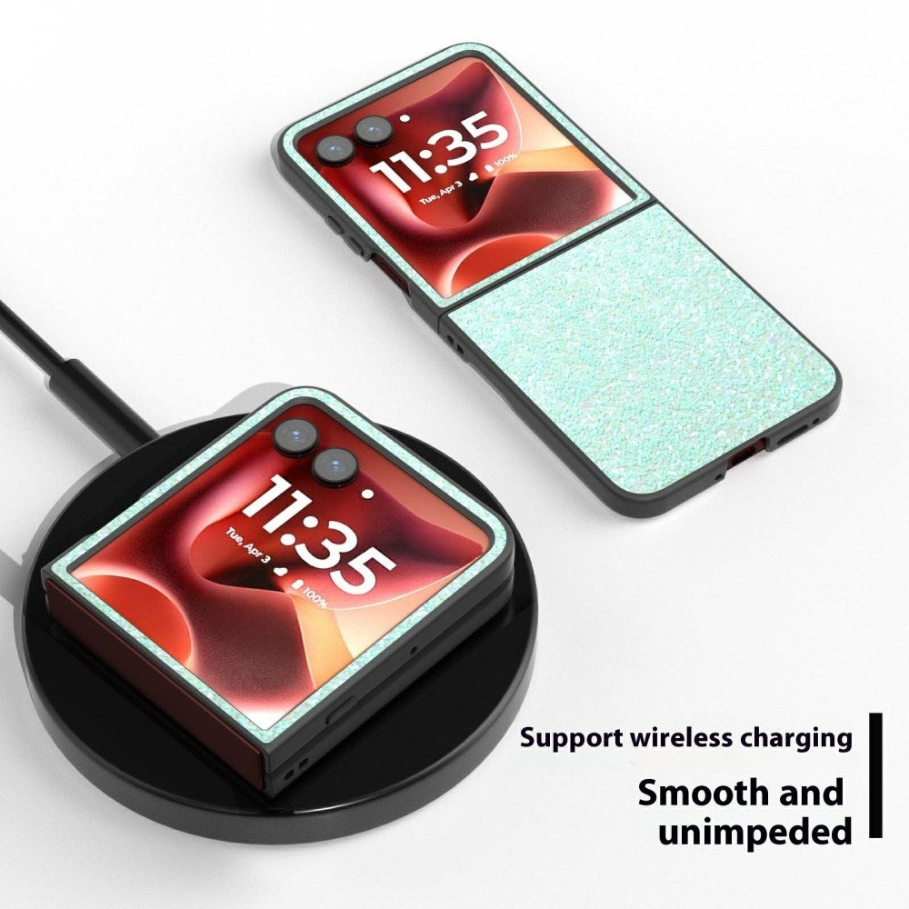 Overfladen på bagsiden af dette Motorola Razr 60 Ultra cover ligner næsten kunstlæder, og det føles derfor super behageligt at holde i hånden. Glitteret skaber et visuelt interessant look.