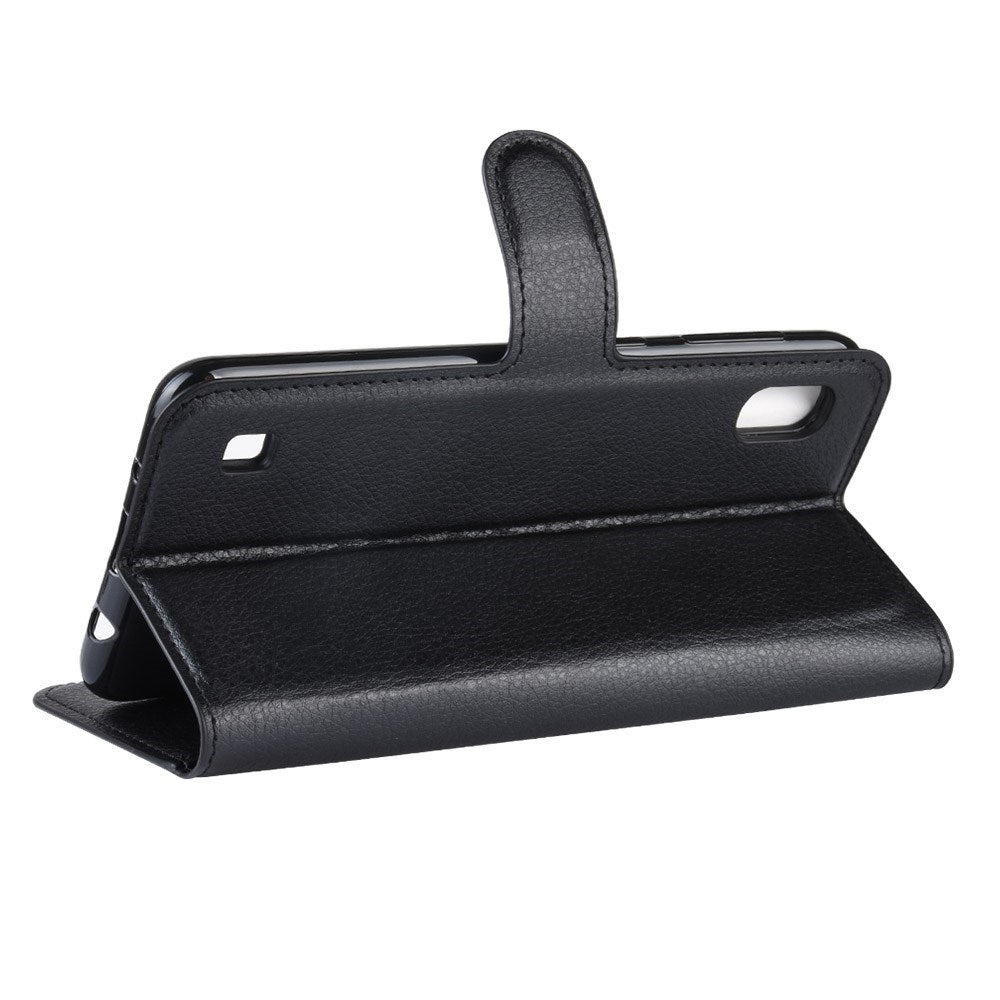 Dette Samsung Galaxy A10 cover holdes åbent og lukket v.h.a. en flap med magnetlås, og indeni er der et fleksibelt plast cover, hvori mobilen skal placeres, mens der i den anden del af coveret er 3 åbninger til kreditkort samt en stor lomme til sedler. Overfladen indeni og udenpå coveret er lavet i imiteret læder, som er glat og har en flot tekstur lige som ægte læder.