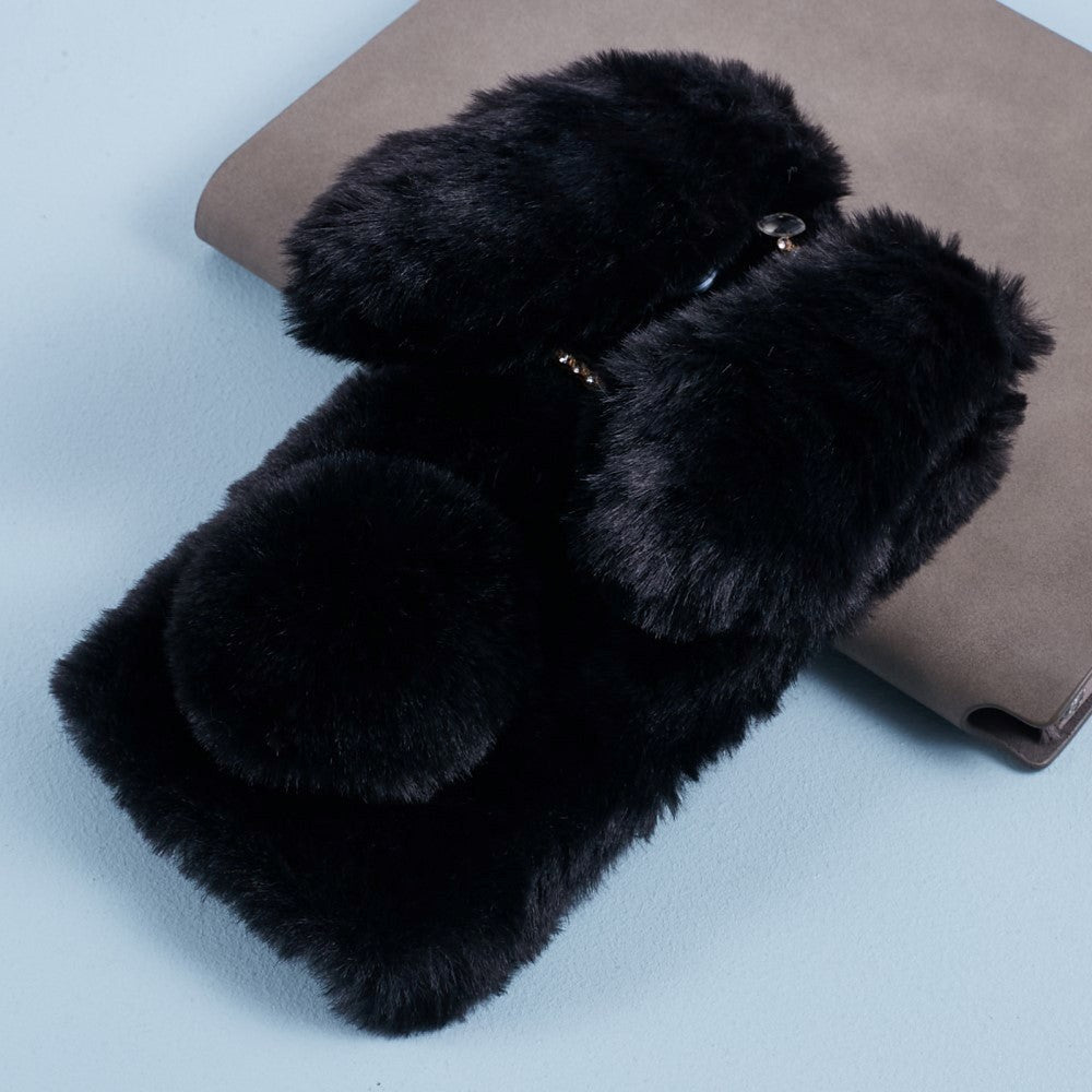 Med dette iPhone 15 Pro cover, får du et spændende og flot udtryk til din smartphone. Det kommer med en pelset bagside som er designet med kaninører og små plastik diamanter rundt om kamera-udskæringen.