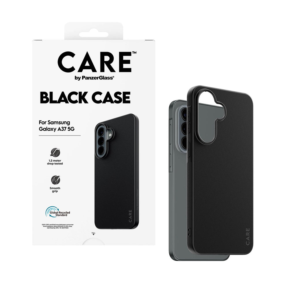 I dette Samsung Galaxy A37 cover får man både solid beskyttelse og et klassisk, stilrent design. CARE by PanzerGlass har fremstillet coveret i genanvendt fleksibelt plast og givet det en blød, mat overflade, der føles behagelig i hånden.