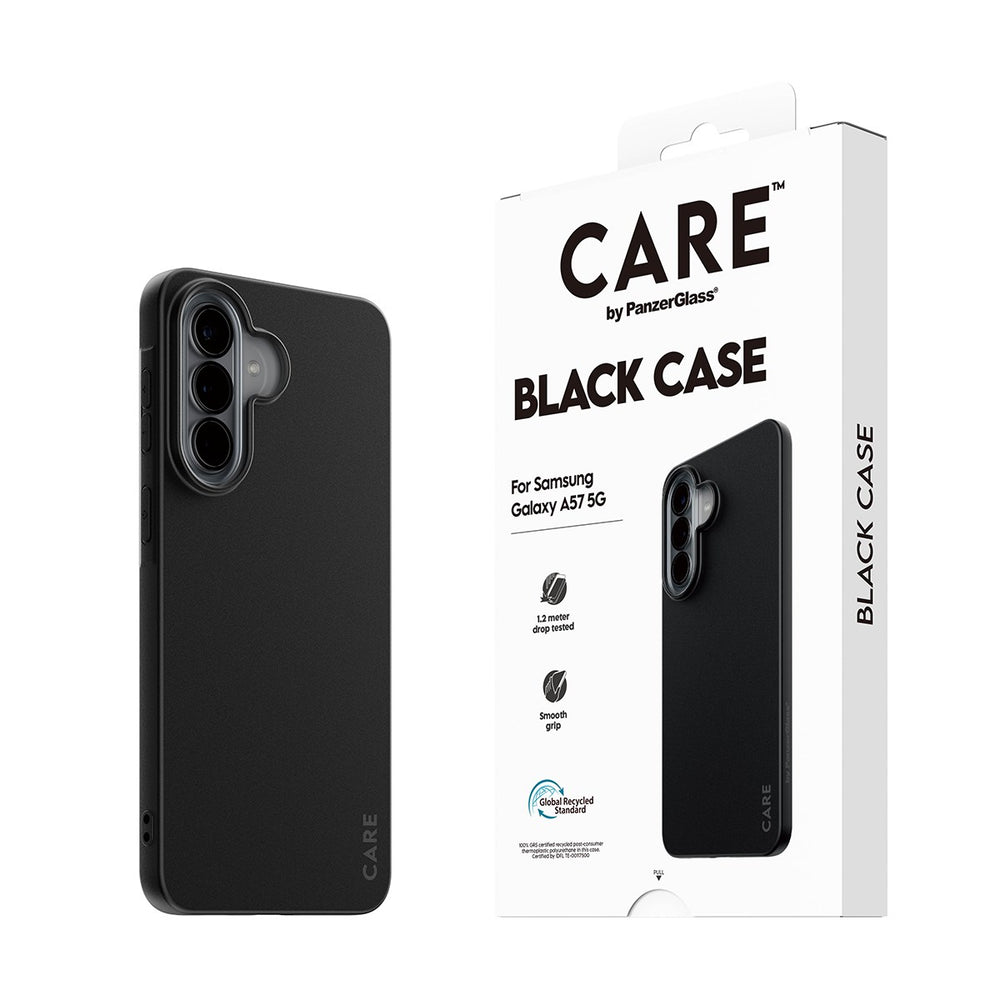 I dette Samsung Galaxy A57 cover får man både solid beskyttelse og et klassisk, stilrent design. CARE by PanzerGlass har fremstillet coveret i genanvendt fleksibelt plast og givet det en blød, mat overflade, der føles behagelig i hånden.