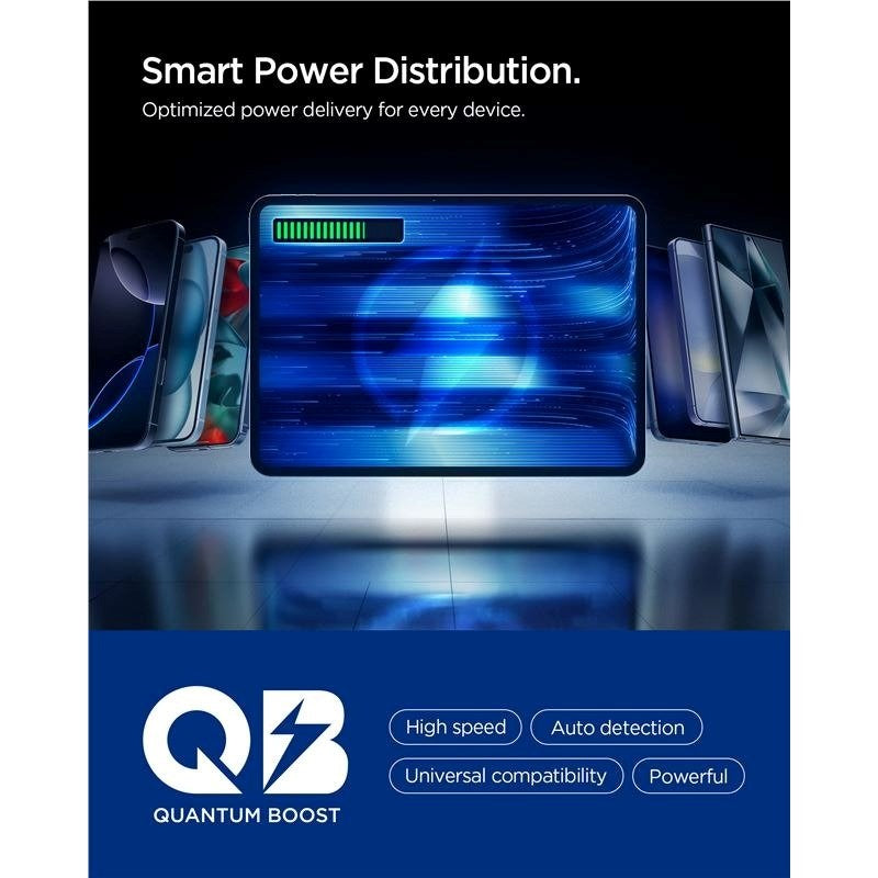 Denne model er udstyret med to USB-C-porte og en USB-A-port. USB-C-portene leverer op til 30W, hvilket sikrer hurtig opladning af kompatible enheder. Quantum Boost-teknologien justerer automatisk opladningsparametrene for at sikre en effektiv og sikker strømforsyning til hver tilsluttet enhed. Den har indbyggede sikkerhedssystemer, der beskytter mod overopladning og overophedning.