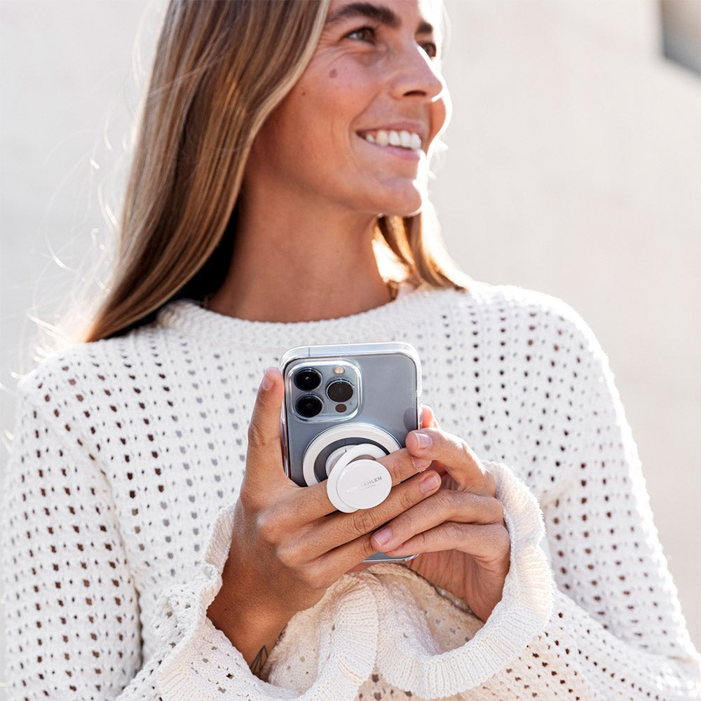 Denne finger ring er udstyret med en magnet, så den kan fastsættes på en MagSafe kompatible enhed/cover. Denne magnet er kompatibel med MagSafe, og du kan derfor placere din fingerholder direkte på din MagSafe kompatible enhed/cover.